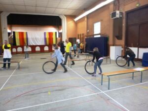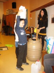 - Stand 2 : Ici les enfants doivent remplir un baril avec des objets qui se trouvent dans la classe tout en ayant un handicap (une seule main, cloche pied, être lié à un autre enfant), puis déplacer le baril rempli jusqu’au point d’arrivée.